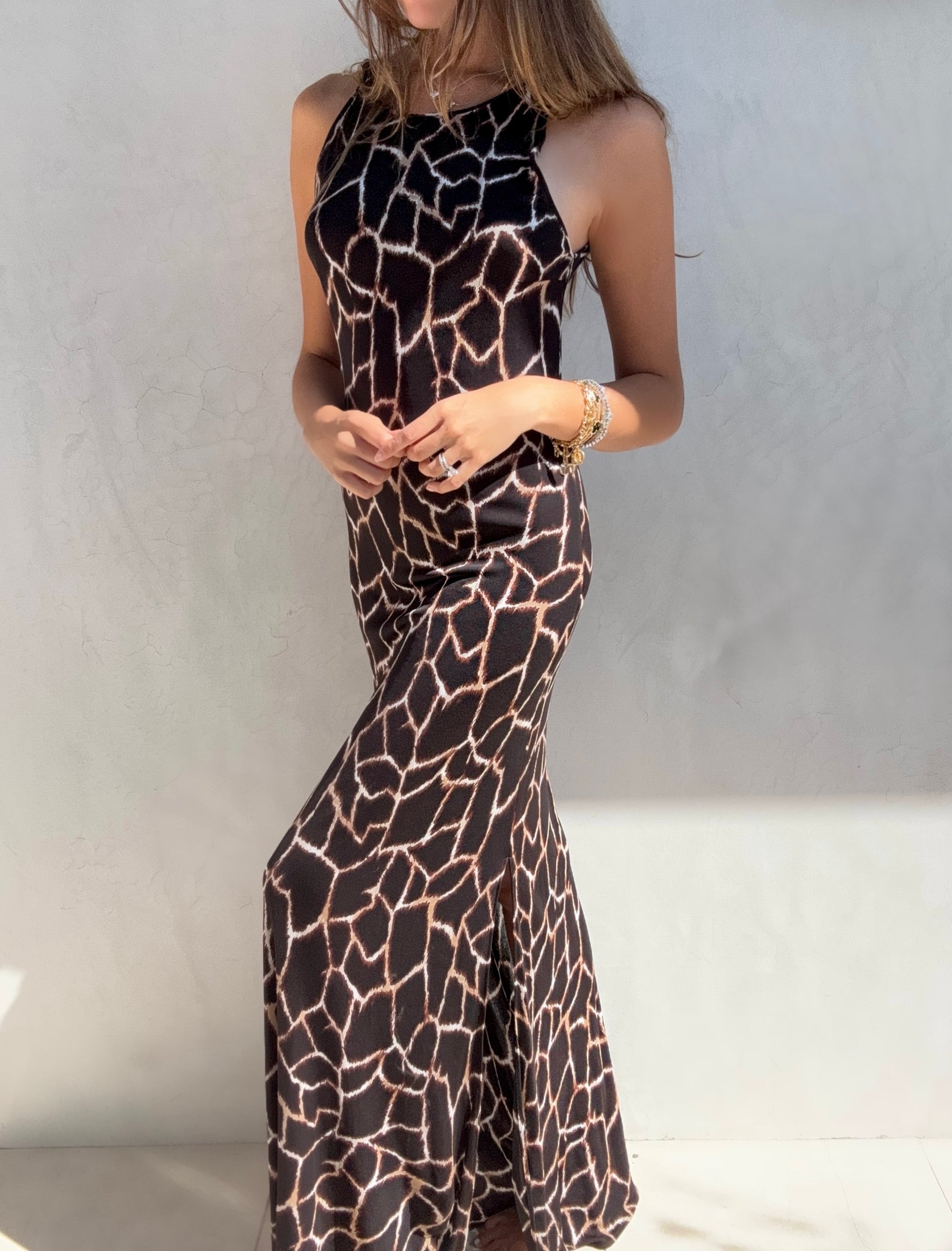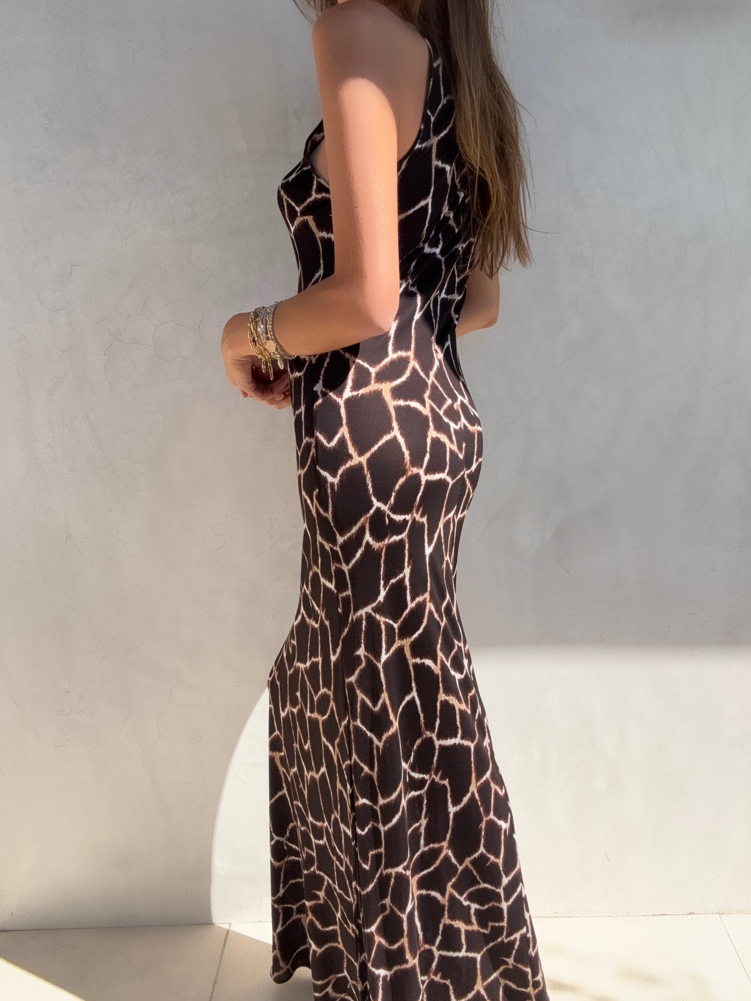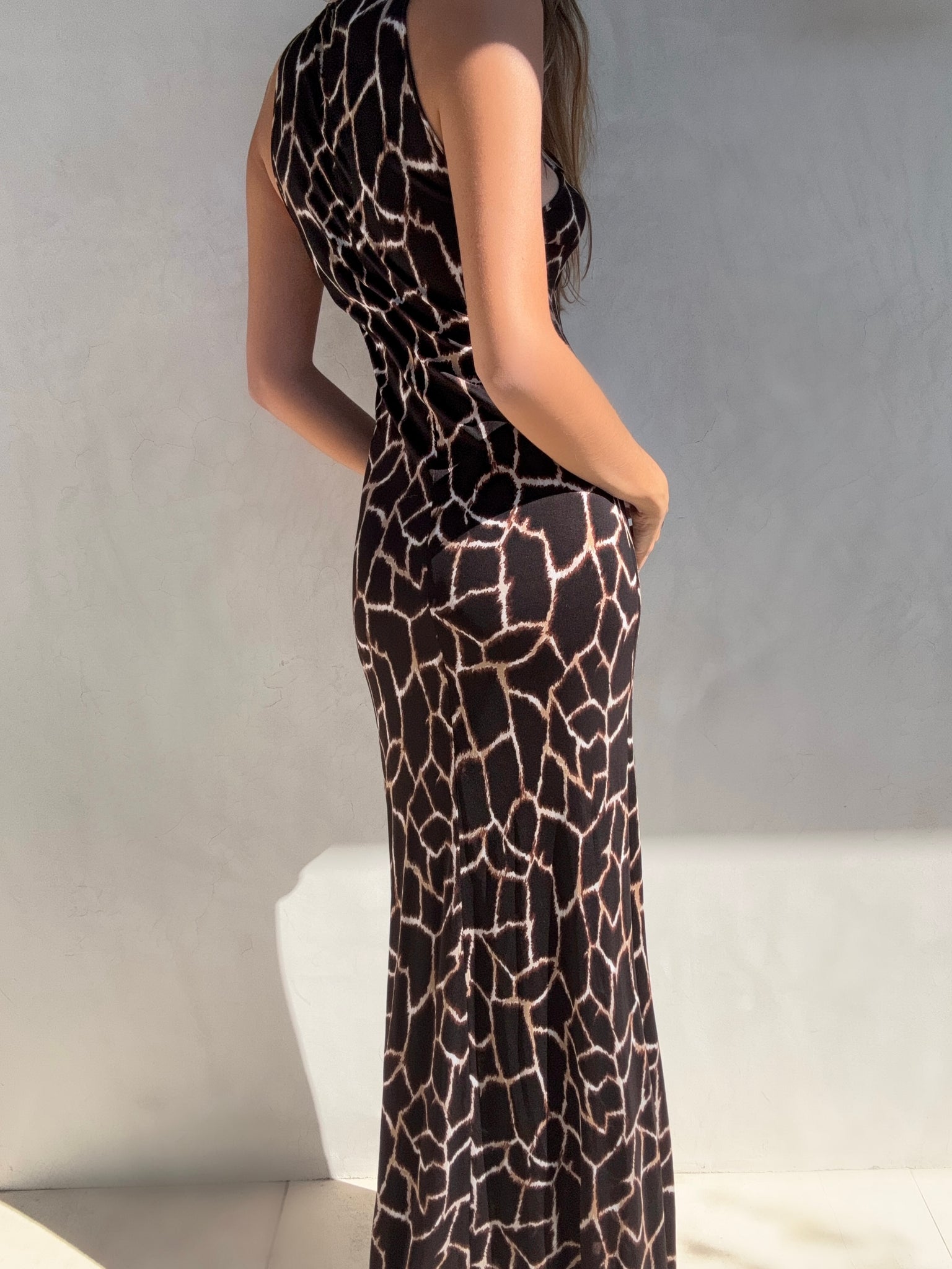 1990s Genny Bodycon Dress, a sleek long silhouette that perfectly hugs the body. Featuring stunning sleeveless styling and a flattering print, this dress is a 90s Genny gem and an elegant addition to elevate your fall wardrobe.