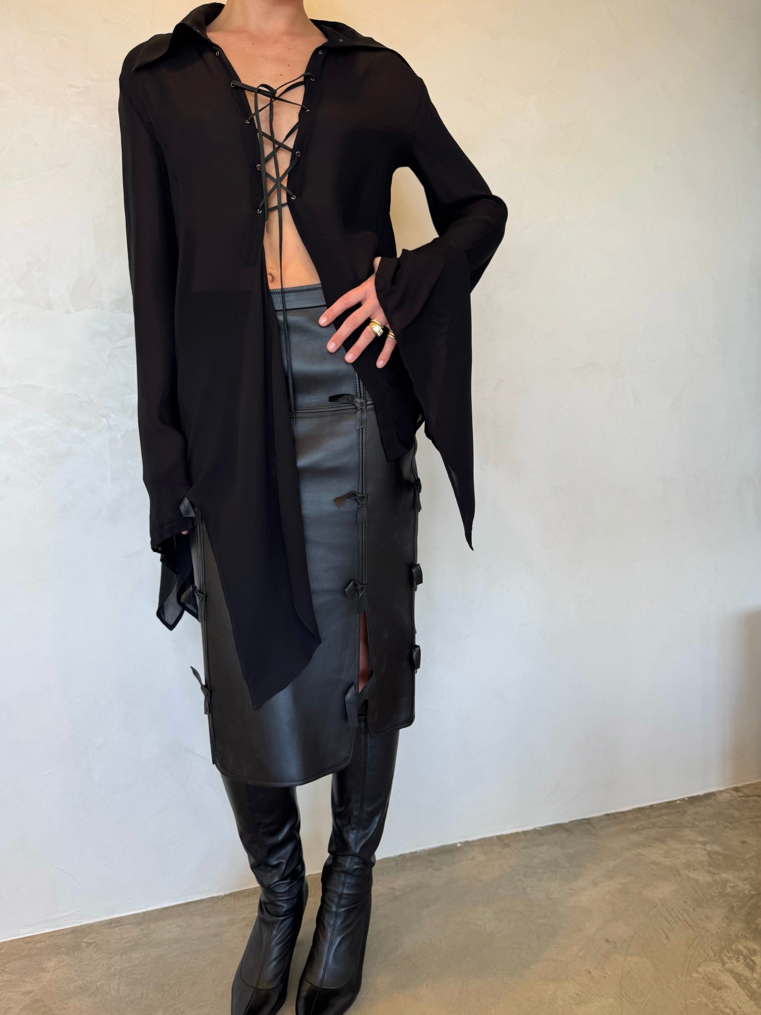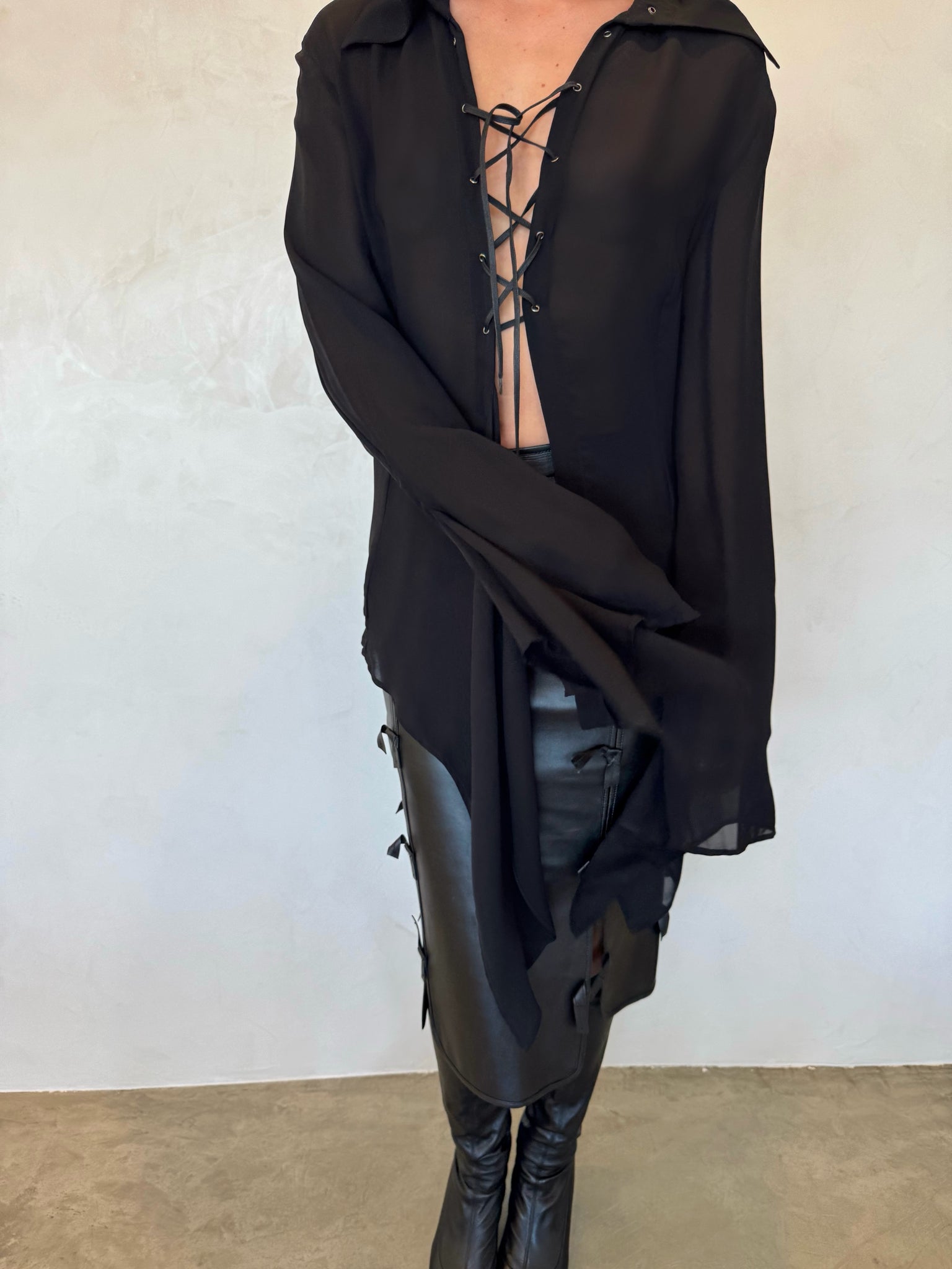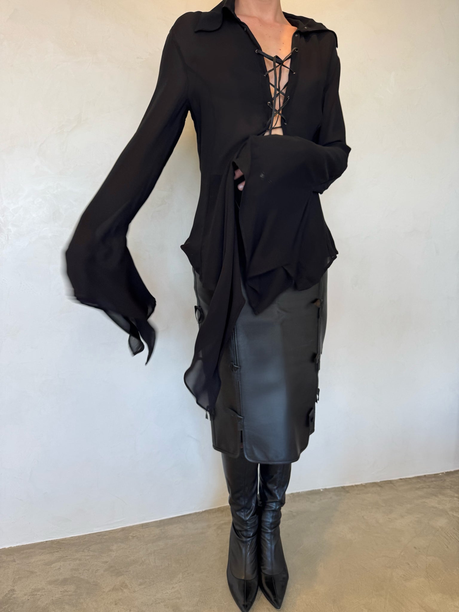 90s Gianfranco Ferre Open Blouse. A rare vintage piece with tie details at the bust, semi-sheer fabric, and exaggerated sleeves. Effortless and timeless a true Gianfranco Ferre gem for your fall wardrobe.