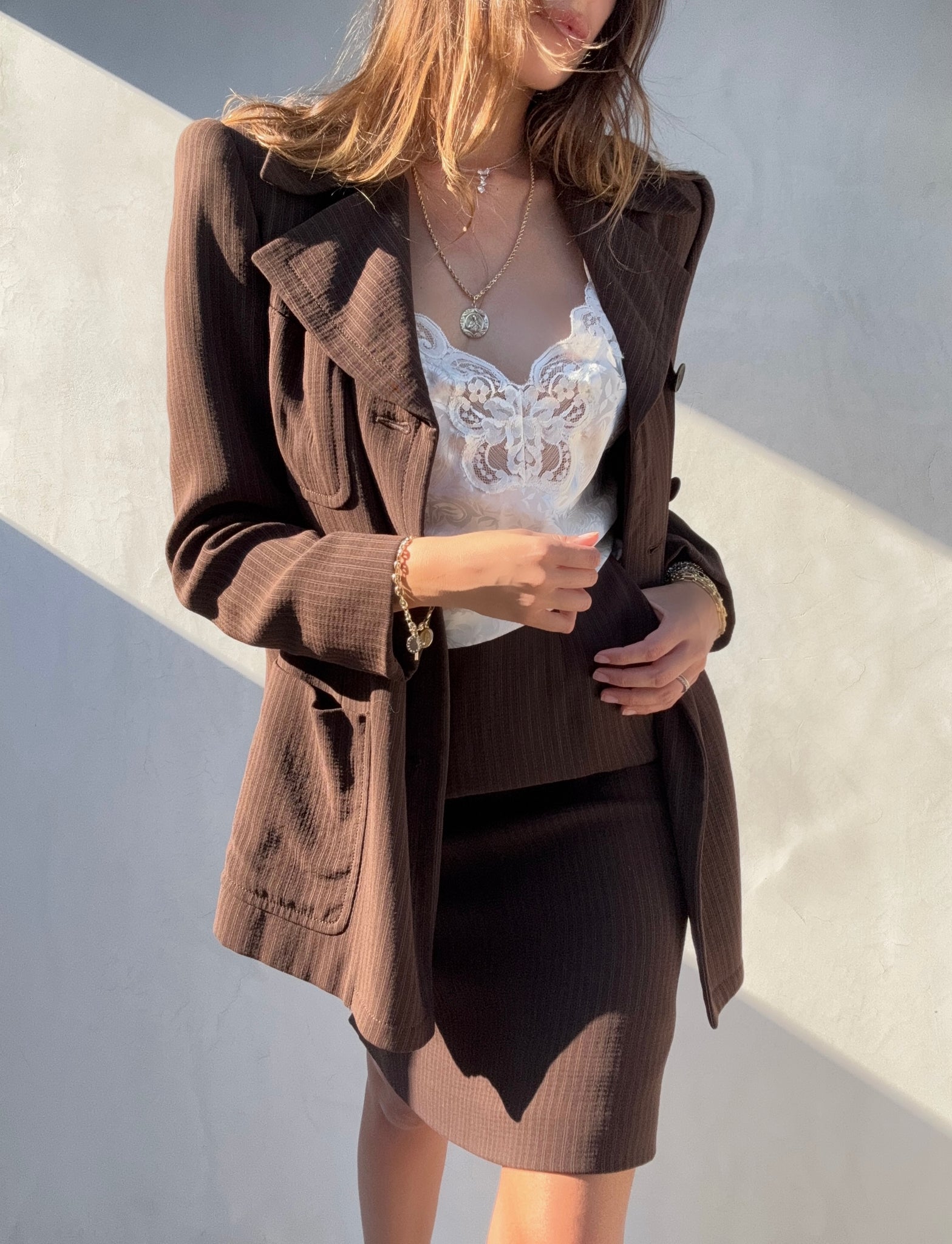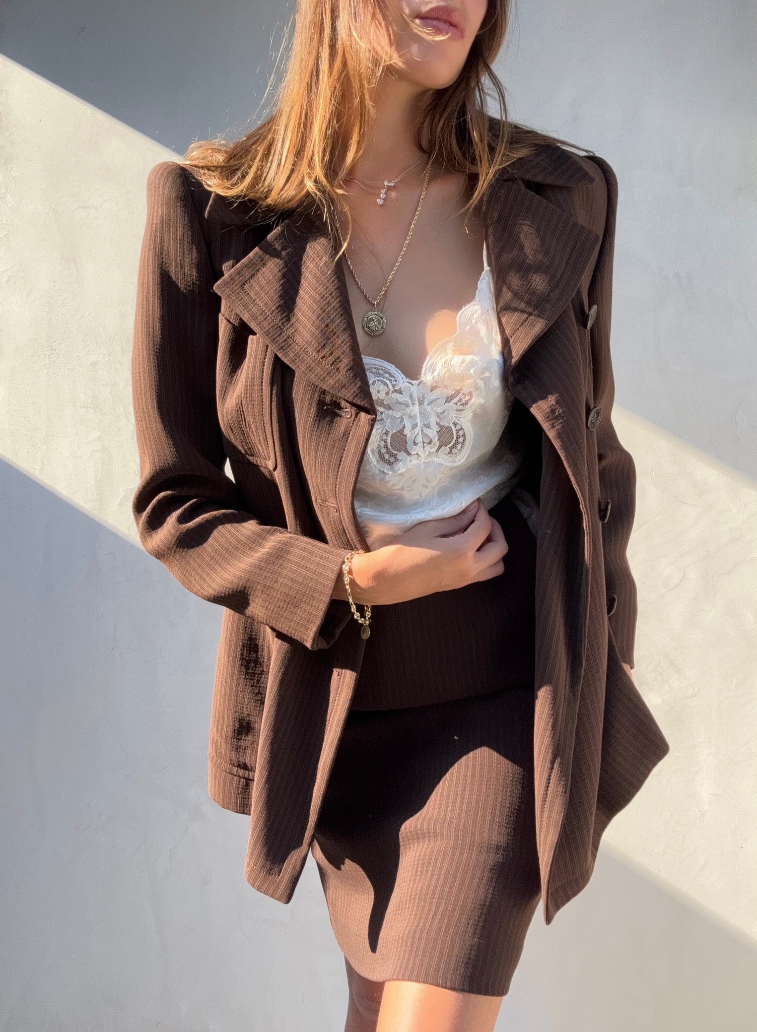 Elevate your style with this Gucci F/W 1995 Pinstripe Skirt Suit. The brown pinstripes add a touch of sophistication throughout, reminiscent of the iconic suit seen on Amber on the 1995 Gucci Fall/Winter runway. The midi-length skirt and double-breasted blazer with light shoulder pads exude timeless elegance. This rare Gucci suit is a stunning addition to your collection.