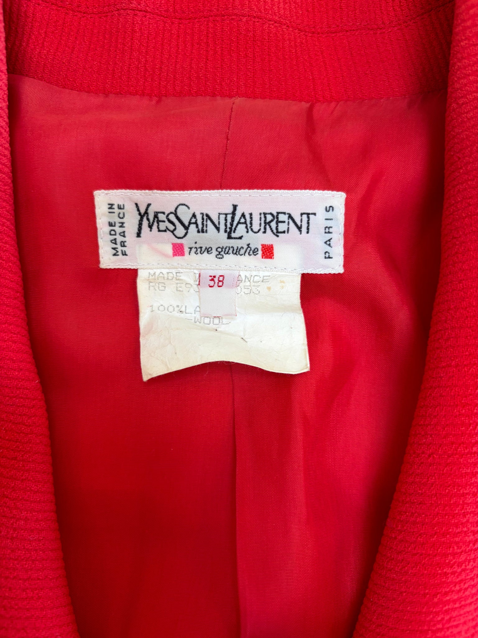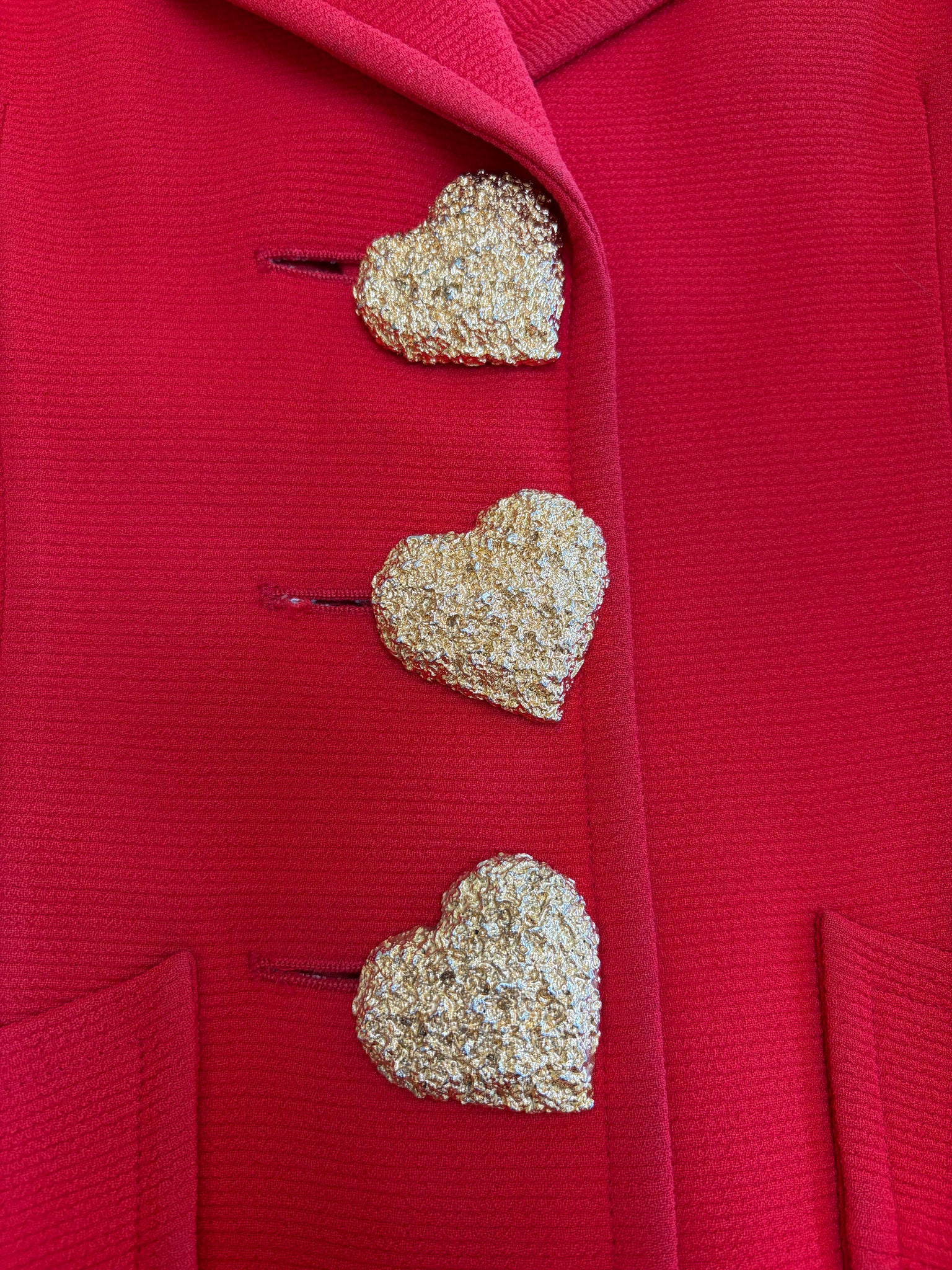 F/W 1993 Yves Saint Laurent Heart Button Runway Blazer in vibrant red, featuring three large gold heart-shaped buttons at the front. As seen on the Fall 1993 runway, this blazer is a rare vintage gem and a true collector’s piece. Own a piece of fashion history with this iconic YSL design.