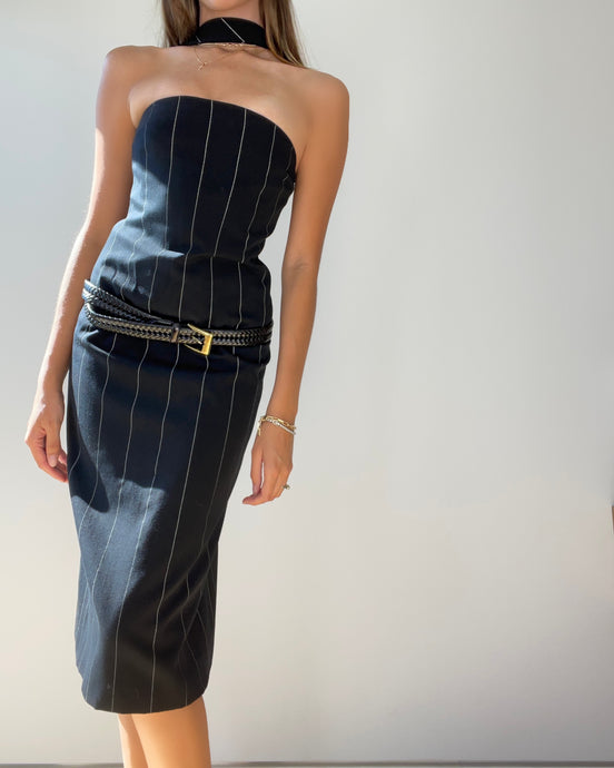 F/W 1997 Gucci by Tom Ford Runway G Logo Buckle Wrap Pinstripe Skirt