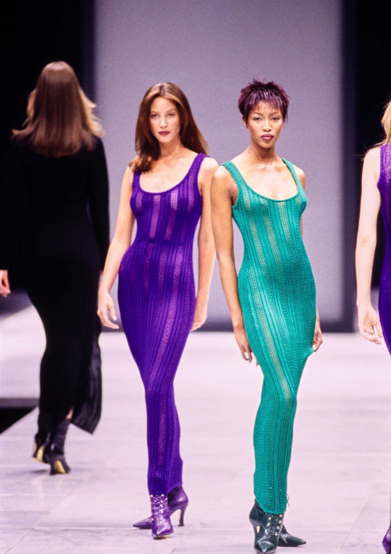 Vintage Gianni Versace Fall 1993 purple open-knit maxi dress — inspired by the unlined version seen on the runway and in the iconic campaign photographed by Richard Avedon. This example is fully lined for wearability while maintaining the dramatic, body-skimming effect of the stretch open knit. Fluid, sensual, and unmistakably Versace, the elongated silhouette moves beautifully on the body and captures the bold glamour of early-90s Versace at its peak. A rare archival piece with serious fashion provenance.