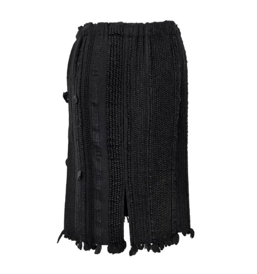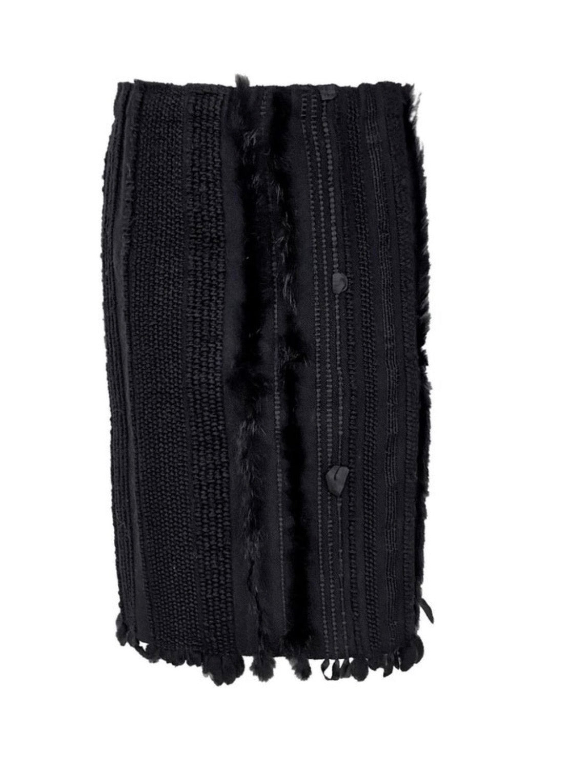Presenting a beautiful black knit skirt by Gucci, designed by Tom Ford from the Fall/Winter 2002 collection. This skirt was featured on the season's runway as part of look 22, worn by model Liisa Winkler.. This knee-length skirt features varying vertical knit patterns and is highlighted with fur and satin ribbon accents. The skirt is made complete with a light fringe at the bottom and a small slit at the back.