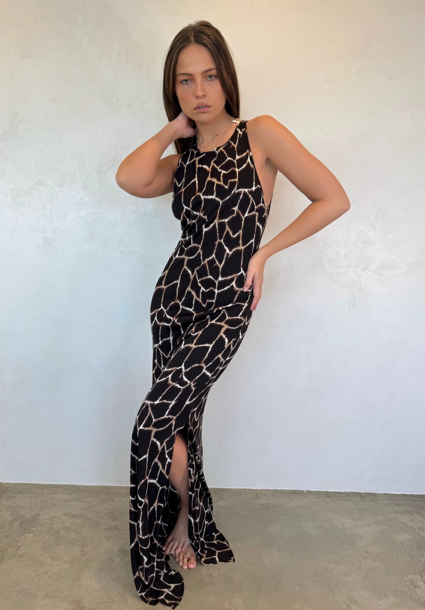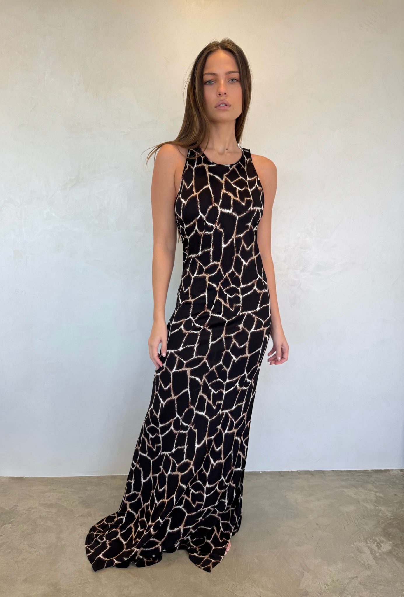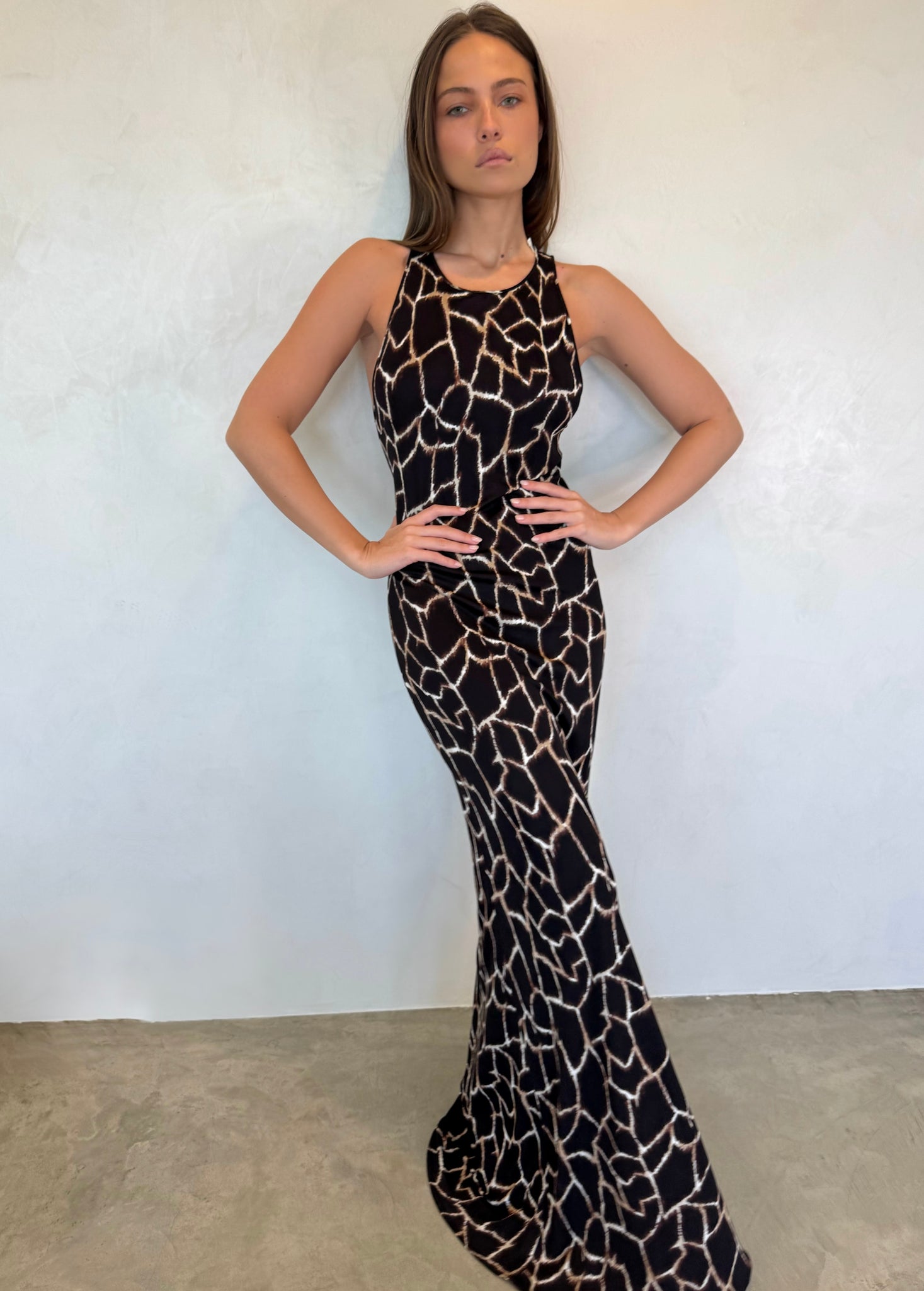 1990s Genny Bodycon Dress, a sleek long silhouette that perfectly hugs the body. Featuring stunning sleeveless styling and a flattering print, this dress is a 90s Genny gem and an elegant addition to elevate your fall wardrobe.