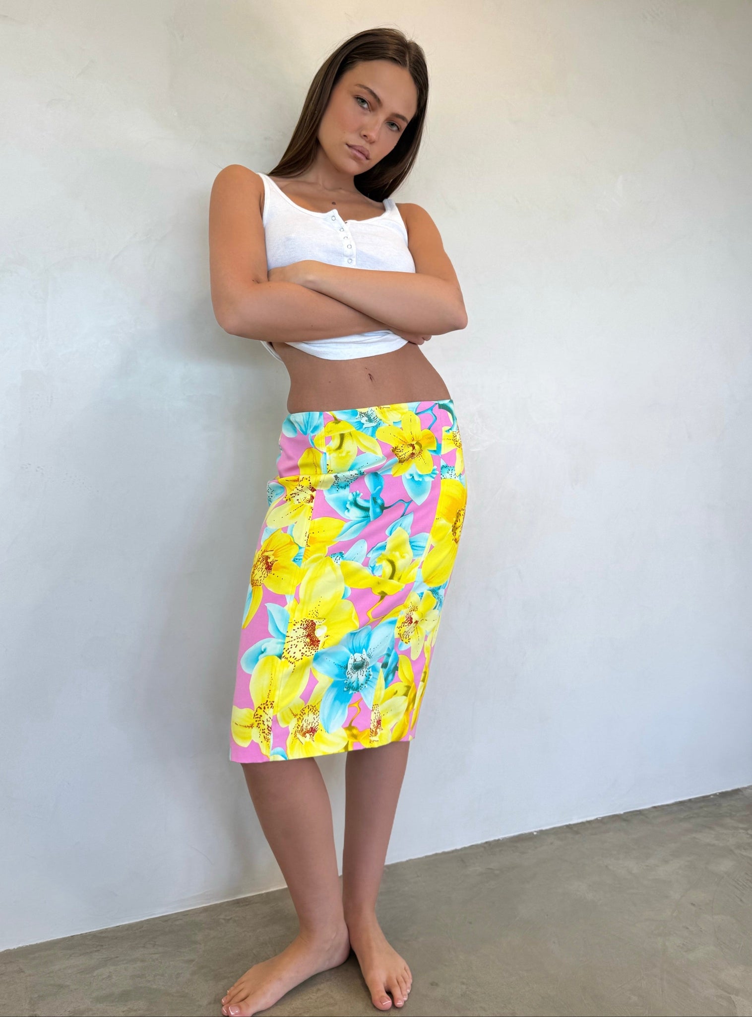 S/S 2004 Versace runway skirt — a striking mid-length silhouette featuring a bold floral design, identical to the version seen on the runway.This skirt captures the house’s early-2000s glamour and confident sensuality. A rare archival piece that elevates any wardrobe with instant impact.